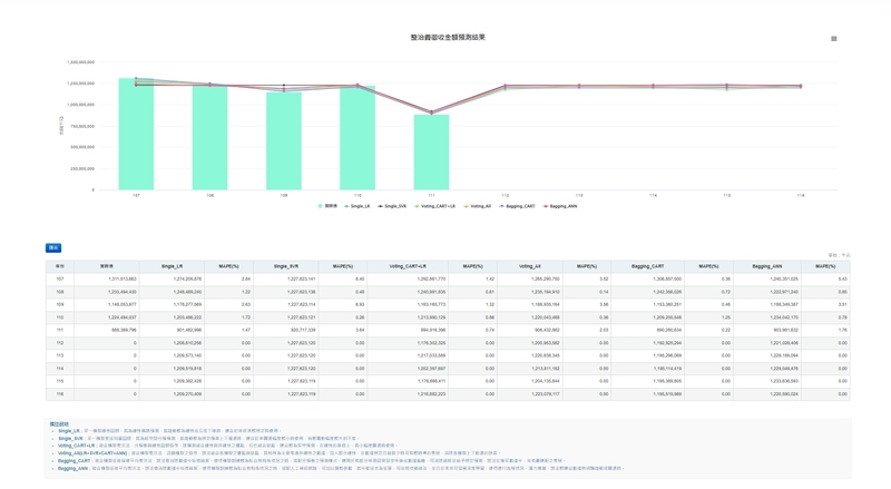 圖說:圖為系統實際使用的畫面,能針對各年份的資料進行6種預測模型的運算,在精確性上已實證比較過,確實較傳統方法優良。